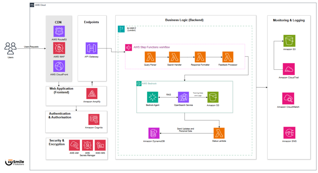 We implemented a modernised AI Engine on a serverless, cloud-native architecture using AWS managed services. Amazon API Gateway and AWS Lambda handle query orchestration, providing elastic scalability and reduced operational overhead. Amazon Bedrock foundation models (Nova Sonic, Titan Embeddings) power intent parsing and embedding generation, converting natural-language queries into structured attributes with greater accuracy.