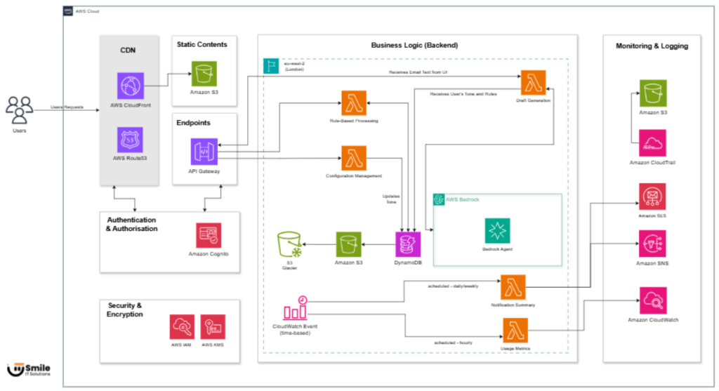 The AI model generates high-quality draft responses, which are then synchronised back into managers’ inboxes through an authenticated integration with their existing email provider. Amazon SQS provides a reliable messaging buffer, ensuring that high volumes of incoming email events are absorbed smoothly without delays. Communication data, activity logs, and draft metadata are stored in an AWS-managed database service, Amazon RDS (Multi-AZ), enabling consistent tracking and operational visibility.